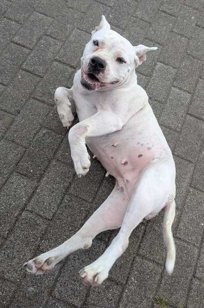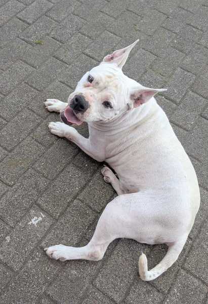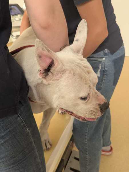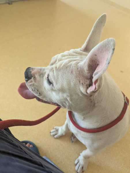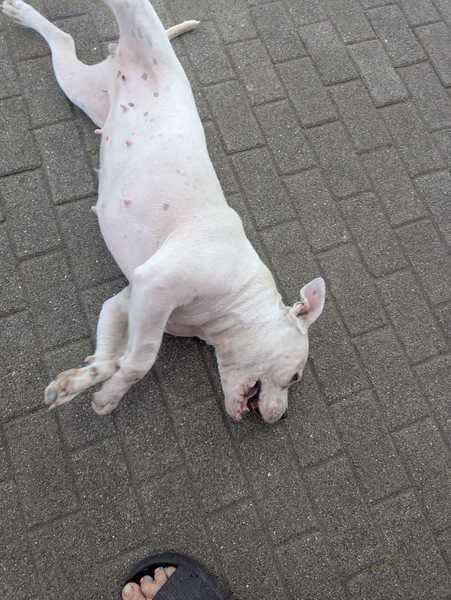 Wir sahen eine kleine weiße Hündin mit riesigen Ohren, die sich vollen Angst an eine Häuserwand mit Brombeeren drückte. Wir haben geklingelt aber niemand hat geöffnet.