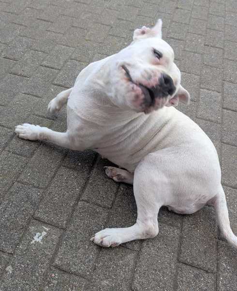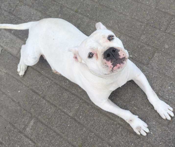 Wir waren erschüttert. Seit 18 Monaten lebt die 4-jährige taube angeblich OEB- Dogo Argentino- Mischlingshündin an dieser Kette und weder die Besitzerin noch der Halter waren sich irgendeiner Schuld bewusst. Sie hatten wohl versucht Luna zu verkaufen, aber das hat nicht geklappt, So dass die Kette die Lösung war. Und laut eigener Aussagen, hat sie diesen Platz sehr selten verlassen.