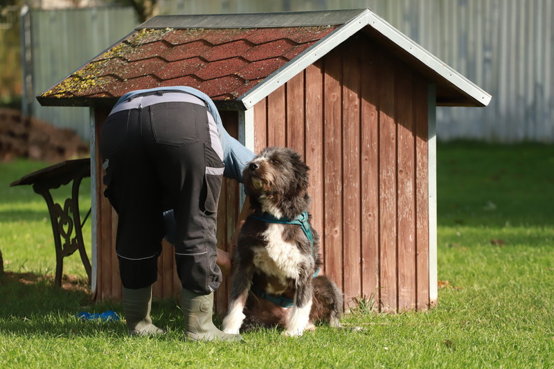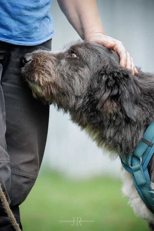 Hier zeigt es sich als absolut lieber und freundlicher Hund. Er ist verträglich mit Hunden und Katzen und er liebt seine Menschen. An der Leine laufen fand er anfänglich doof, jetzt trabt er aber schon fröhlich mit. Er geht auch schon freiwillig mit ins Haus, ist aber auch draußen zufrieden.