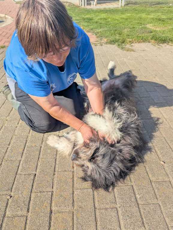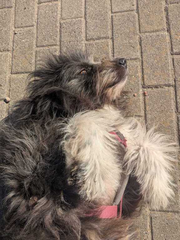 Als er bei uns ankam war sein Fell verfilzt und er hat nicht gut gerochen. Er sich braf ein Bad gefallen lassen und die ganz schlimmen Stellen wurden abgeschoren und der Rest ein bisschen in Ordnung gebracht.
