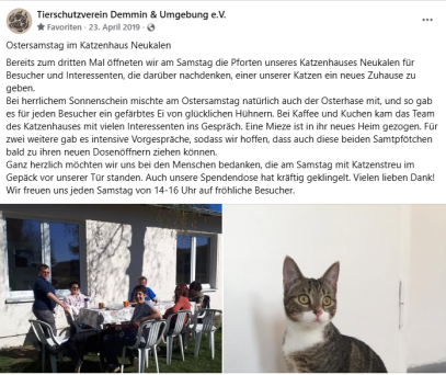 Unser Katzenhaus Neukalen befindet sich auf der Mecklenburgischen Seenplatte (Kummerower See) und liegt ländlich in der Gegend nicht weit weg von der Hansestadt Demmin. Wir sind eine Zweigstelle vom Tierschutzverein Demmin (wo sich unsere Hunde und Kleintiere befinden) Hier im Katzenhaus Neukalen kümmern wir uns um Fundkatzen und Abgabekatzen. Insgesamt hat unser Katzenhaus Neukalen für 40 Tiere Platz. Welche von engagierten Tierschützer betreut werden.